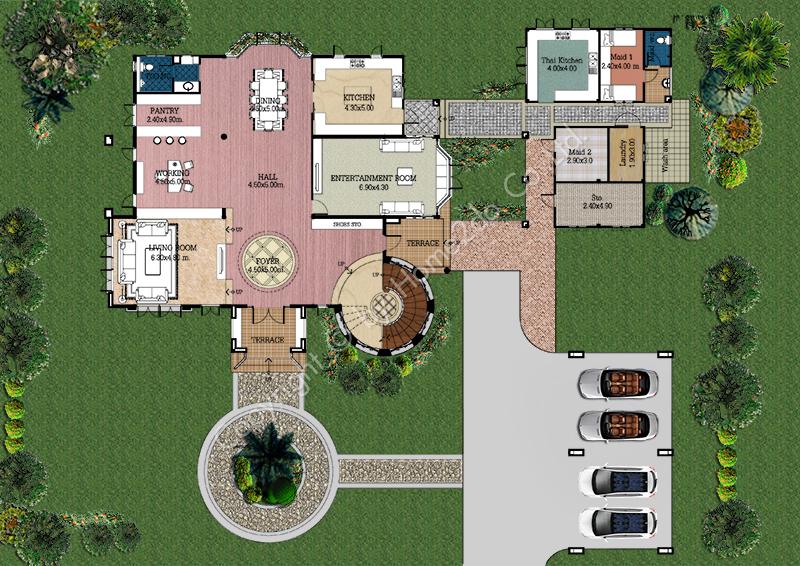 บ้านสไตล์คอนเทมโพลารีขนาดใหญ่ โดดเด่นด้วยทางเข้าบ้านที่สูงถึงชั้นสอง ห้องเอ็นเตอร์เทนเมนต์ขนาดใหญ่ บันไดวนขึ้นชั้นสอง พื้นที่ทำงาน / ห้องพระ / ห้องครัวไทย / ครัวฝรั่ง / ห้องแม่บ้าน และที่จอดรถขนาดใหญ่ รองรับถึง 4 คัน