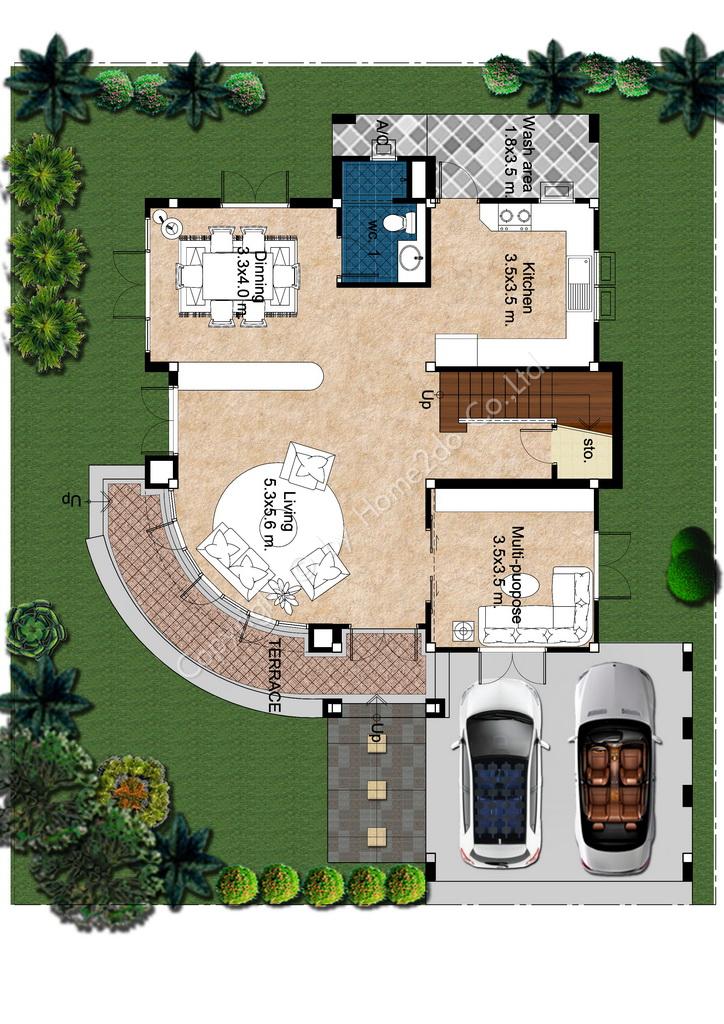 บ้านสวย 2 ชั้น รูปแบบ MODERN โดดเด่นด้วยห้องรับแขก และ ห้องพักผ่อนทรงโค้ง เปิดโล่งรับธรรมชาติ พื้นที่ใช้สอยห้องรับแขก และ ห้องอาหารเปิดโล่งเชื่อมต่อกันอย่างลงตัว