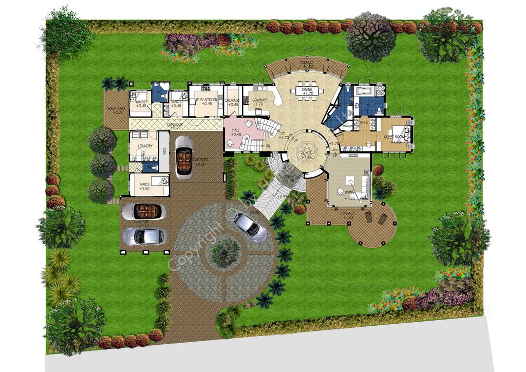 บ้านสไตล์ Spanish ขนาดใหญ่โดดเด่นด้วยรูปลักษณ์ทรงกลม บริเวณโถงหน้าบ้าน terrace และพื้นที่รับประทานอาหาร ที่จอดรถถึง 4 คัน ทั้งยังมีการแบ่งการใช้งานเป็นสัดส่วนชัดเจน มีบันไดโค้งขนาดใหญ่ เป็นจุดเด่นและเพิ่มความสวยงามให้ตัวบ้านเป็นอย่างดี ด้วยพื้นที่และ space ห้องทานอาหาร ที่ถูกจัดวางให้สามารถมองวิวบริเวณหลังบ้าน และฝ้าที่เปิดโล่งถึงชั้น 2 ถือว่าเป็นอีกจุดสนใจหนึ่งของตัวบ้านเช่นเดียวกัน