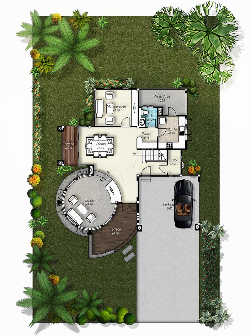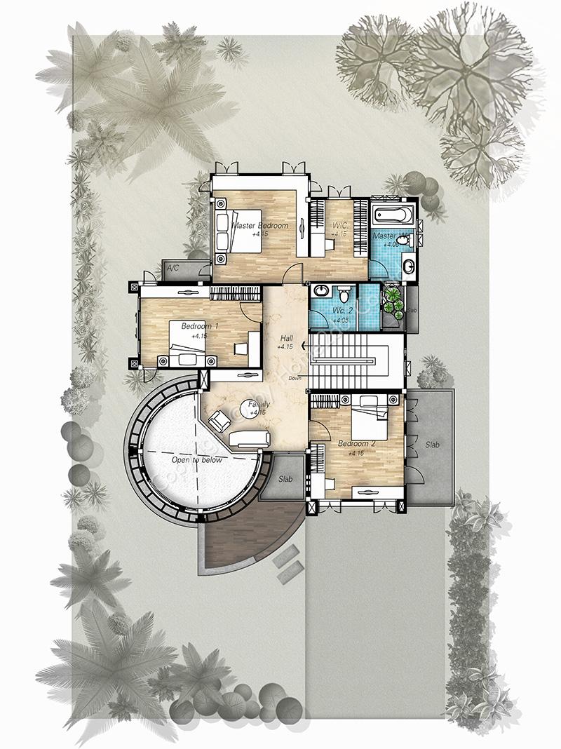 บ้าน Tropical Modern ที่โดดเด่นด้วยห้องรับแขกที่ออกแบบมาในลักษณะวงกลม และมีความสูงถึงชั้นสอง ช่วยให้ห้องดูกว้างขึ้น พิเศษด้วยห้องอเนกประสงค์ / Pantry / ห้องครัวไทย และพื้นที่นั่งเล่นโถงชั้น 2